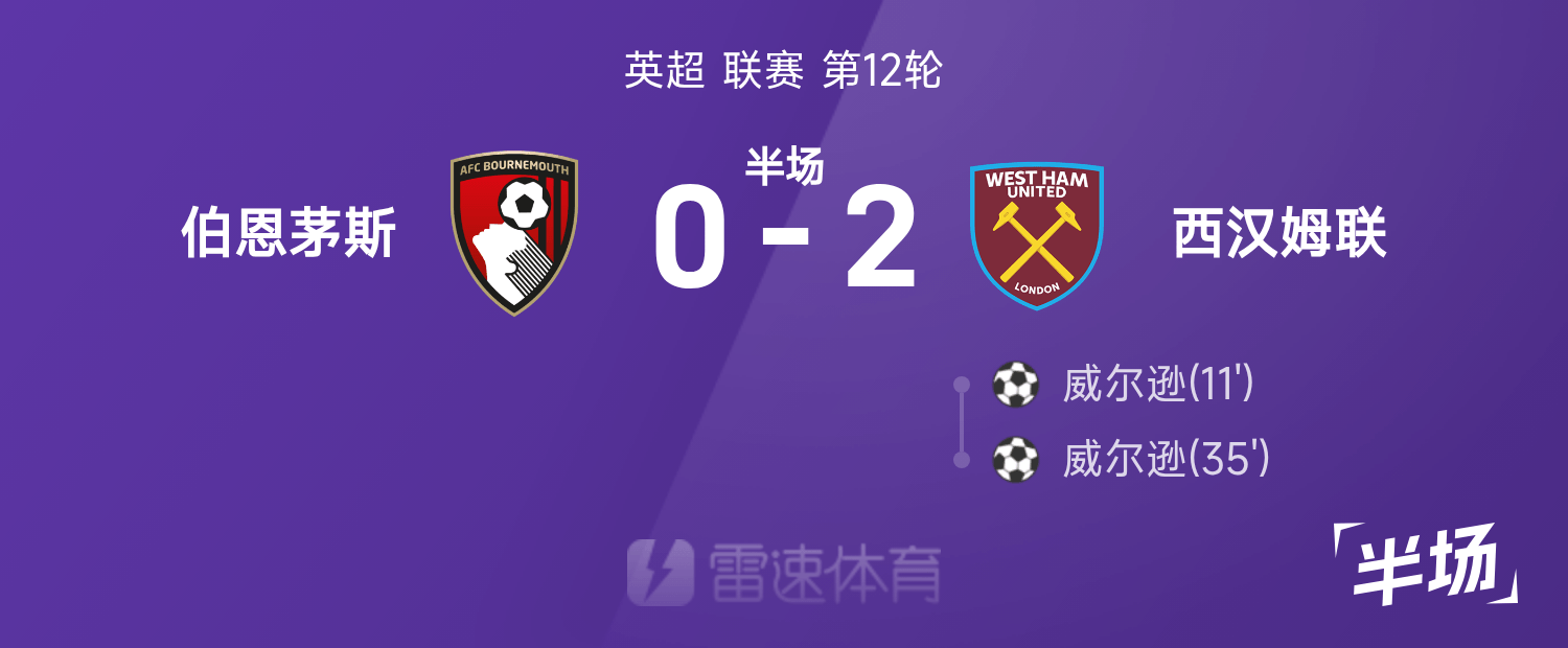 雷速體育11月22日訊 25/26賽季英超聯(lián)賽第12輪,伯恩茅斯迎戰(zhàn)西漢姆聯(lián)。半場戰(zhàn)罷,雙方比分暫為伯恩茅斯0-2西漢姆聯(lián),威爾遜上演梅開二度。