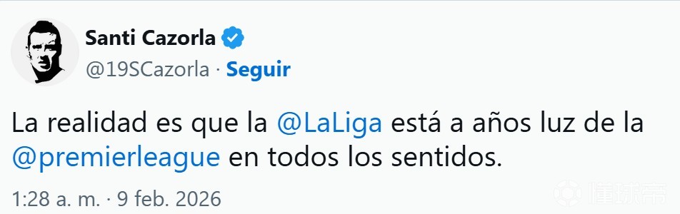 在個(gè)人社交平臺(tái)上,卡索拉毫不留情地寫道:“現(xiàn)實(shí)是,西甲在各個(gè)方面都與英超相差好幾個(gè)層級(jí)?!边@條簡(jiǎn)短卻尖銳的發(fā)言迅速引發(fā)熱議,并在網(wǎng)絡(luò)上廣泛傳播。