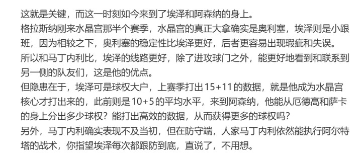所以從這個角度來說,阿森納當然可以覺得自己很倒霉,這一點也的確是事實,包括埃澤的防區(qū)丟球,也是新援加盟,來到新位置需要交的學費,但在這些事情之外,阿森納也需要觀察一下自己的戰(zhàn)術流暢度。